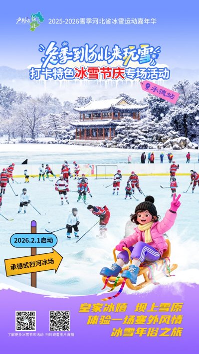 纵览客户端讯(记者刘涛 王学峰)2月1日,2025-2026雪季河北省冰雪运动嘉年华“冬季到河北来玩雪 打卡特色冰雪节庆”专场活动(承德站)暨承德市冰雪嘉年华系列活动将在承德武烈河冰场开启。本次活动将承德皇家文化、新春意蕴与冰雪活动相融合,让冰雪爱好者在冰封雪裹的好山水中,感受冰雪户外的酣畅激情。