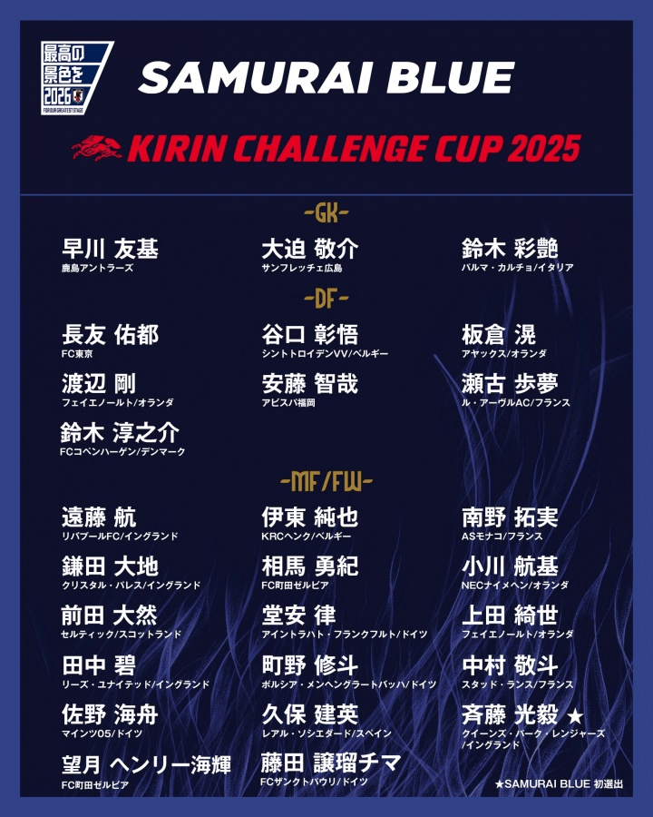 中前场:远藤航(利物浦)、伊东纯也(亨克)、南野拓实(摩纳哥)、镰田大地(水晶宫)、相马勇纪(町田泽维亚)、小川航基(奈梅亨)、前田大然(凯尔特人)、堂安律(法兰克福)、上田绮世(费耶诺德)、田中碧(利兹联)、町野修斗(门兴)、中村敬斗(兰斯)、佐野海舟(美因茨)、久保建英(皇家社会)、齐藤光毅(女王公园巡游者)、望月海辉(町田泽维亚)、藤田让瑠-奇马(圣保利)
