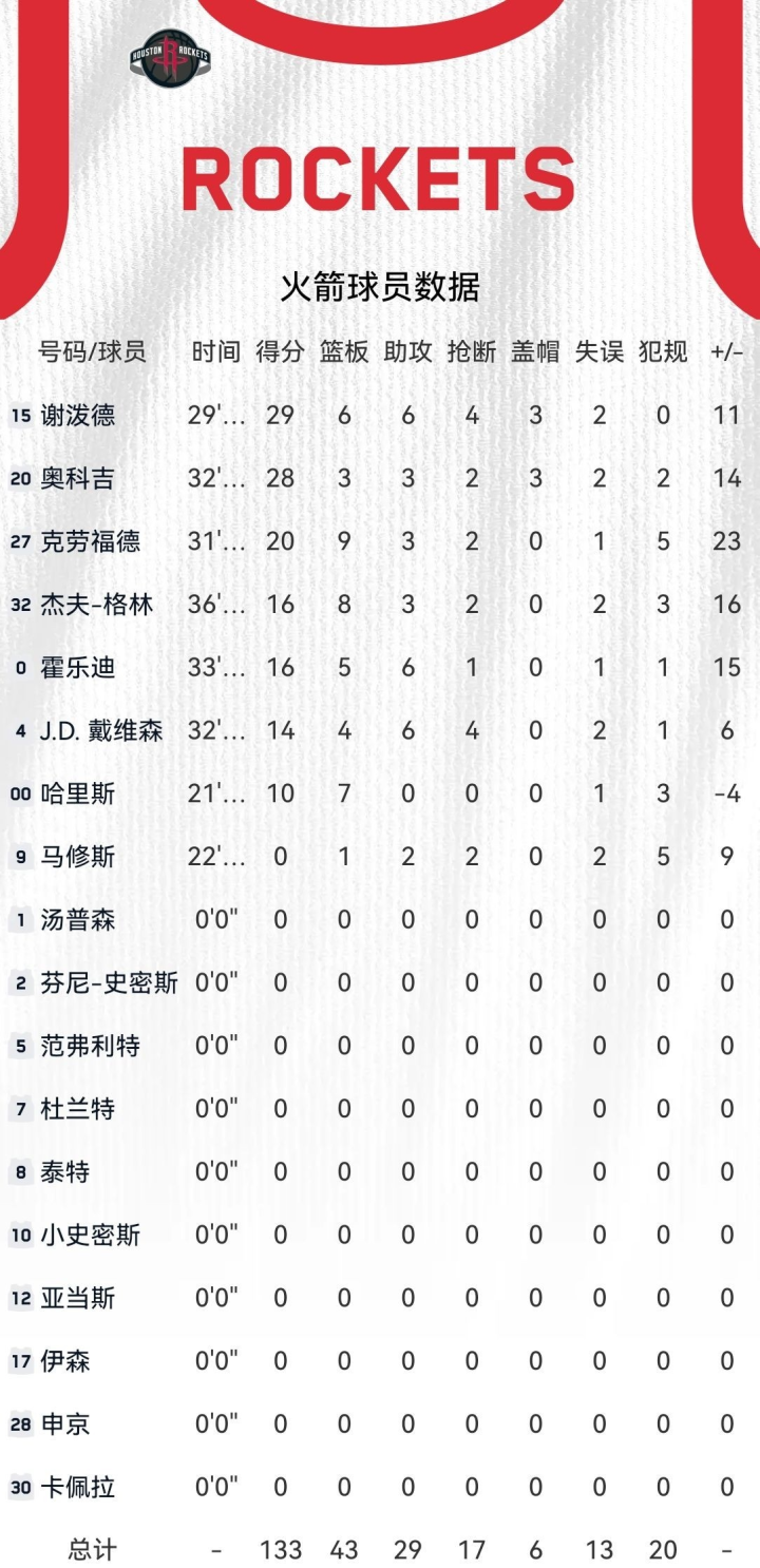 球员表现上,谢泼德堪称全场最佳,全场出战29分钟,22投12中,三分球13投5中,砍下29分6篮板6助攻4抢断3盖帽的全面数据,正负值+11,攻防两端都展现出极强的统治力。奥科吉也有28分3篮板3助攻入账,15投8中,罚球12罚10中,内线冲击力十足,攻防一体的表现让人印象深刻。此外,克劳福德(21分8篮板3助攻)、老格林(16分8篮板3助攻)、霍勒迪(16分6篮板6助攻)、戴维森(14分5篮板6助攻)和哈里斯(10分7篮板)也都有稳定贡献,全队多点开花。