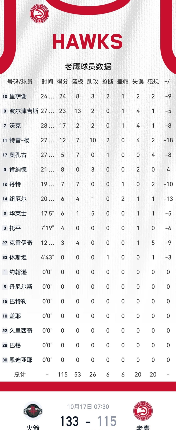 老鹰方面,特雷-杨表现低迷,14投仅4中,三分球6投2中,仅得12分7篮板10助攻,效率低下,正负值-18为全队最低;里萨谢(24分7篮板3助攻)和波尔津吉斯(23分4篮板2助攻)虽有不错数据,但难阻球队失利。