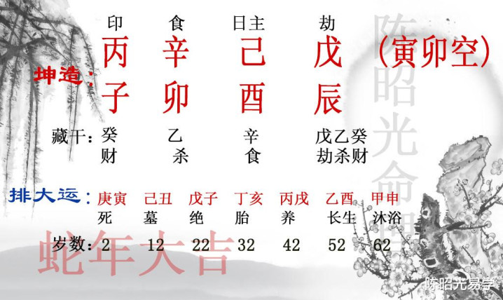 坤造:丙子,辛卯,己酉,戊辰(寅卯空)