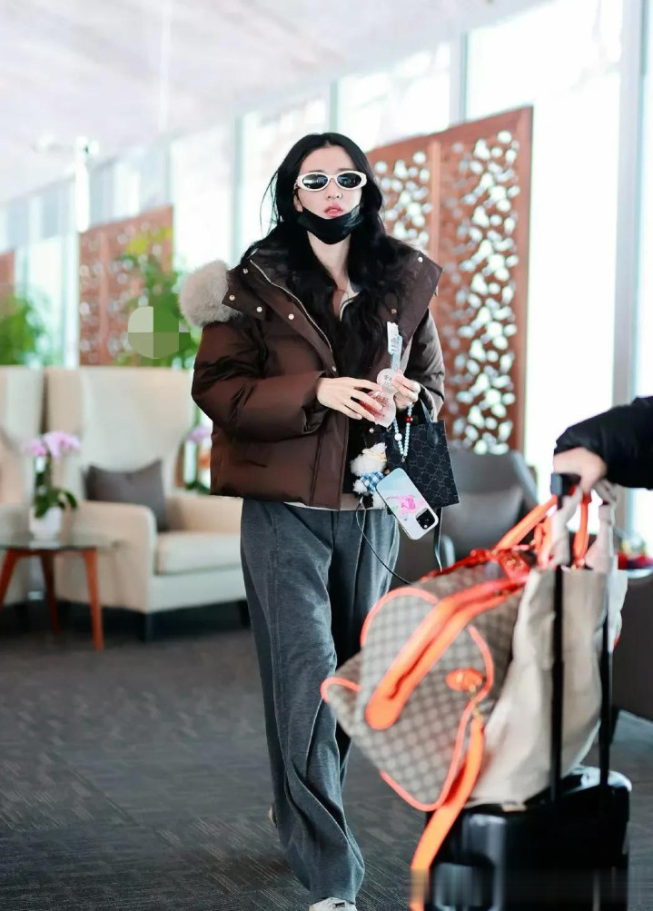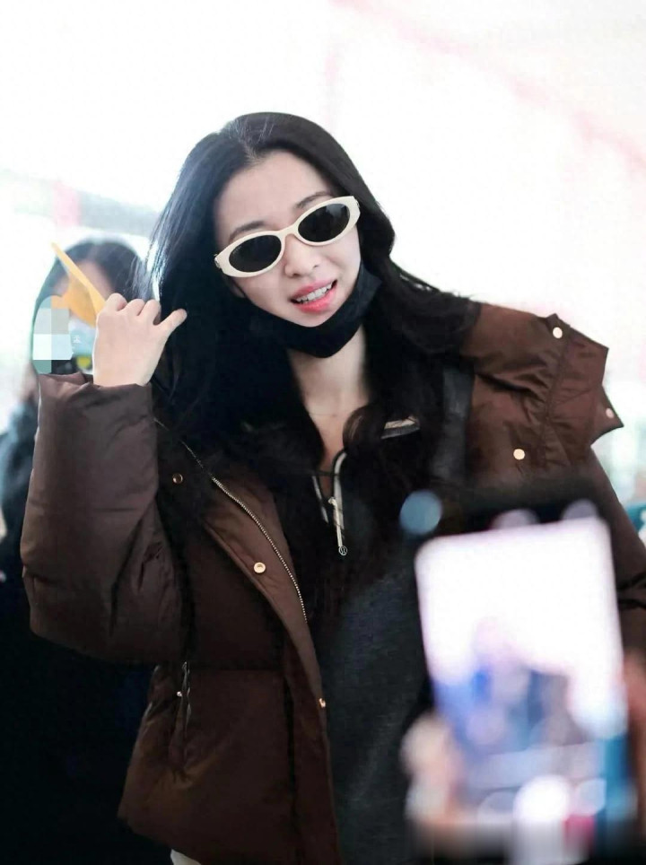 王楚然机场私服真会穿! 棕色羽绒服+灰色直筒裤, 休闲时髦又高级